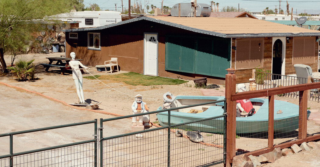 There are two ways to experience the town of Bombay Beach, Calif., as a visitor: gawk at the spectacle or fall into the vortex. Thousands of tourists cruise through each year, often without getting out of their cars to see decaying art installations left over from an annual mid-March gathering of artists, photographers and documentarians known jokingly as the Bombay Beach Biennale. When I went to the town for the first time in 2021, I was looking for salvation in this weird desert town on the Salton Sea south of Palm Springs and Joshua Tree National Park. I dropped in, felt vibes and left with stories. I stared at the eccentric large-scale art, posted photos on Instagram of ruin porn and a hot pink sign on the beach that said, “If you’re stuck, call Kim.” I posed in front of a mountain of painted televisions, swung on a swing over the edge of the lake’s retreating shoreline and explored the half-buried, rusted-out cars that make up an abandoned ersatz drive-in movie theater. On that trip, it felt as if I were inside a “Mad Max” simulation, but I was only scratching the surface of the town.